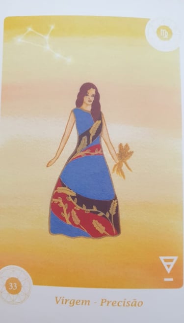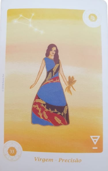 O signo de Virgem fala da capacidade do ser humano de se conectar ao planeta Terra, á natureza, e de permitir sua integração interna a fim de gerar a mudança. A frequência de Virgem nos ensina a nos rendermos á natureza á nossa volta, tornando-nos, assim, parte natural do ciclo da vida. Esta carta sugere (e recomenda) mudanças á vista: mudanças que são muito físicas e práticas. Os "dados" á nossa volta mudam o tempo todo e nos modificam também. O que nos parece estático está, na realidade, em movimento contínuo. Comtemplar a carta Virgem nos ajudará a nos conectarmos com o contínuo movimento da vida, á Terra sobre a qual vivemos e á natureza da qual somos parte inseparável. Esta carta traz muito ancoramento e sensatez. Ela também pode nos ajudar a aceitar uma percepção mais saudável e precisa da nossa saúde, da gestão do corpo e da nossa dieta.